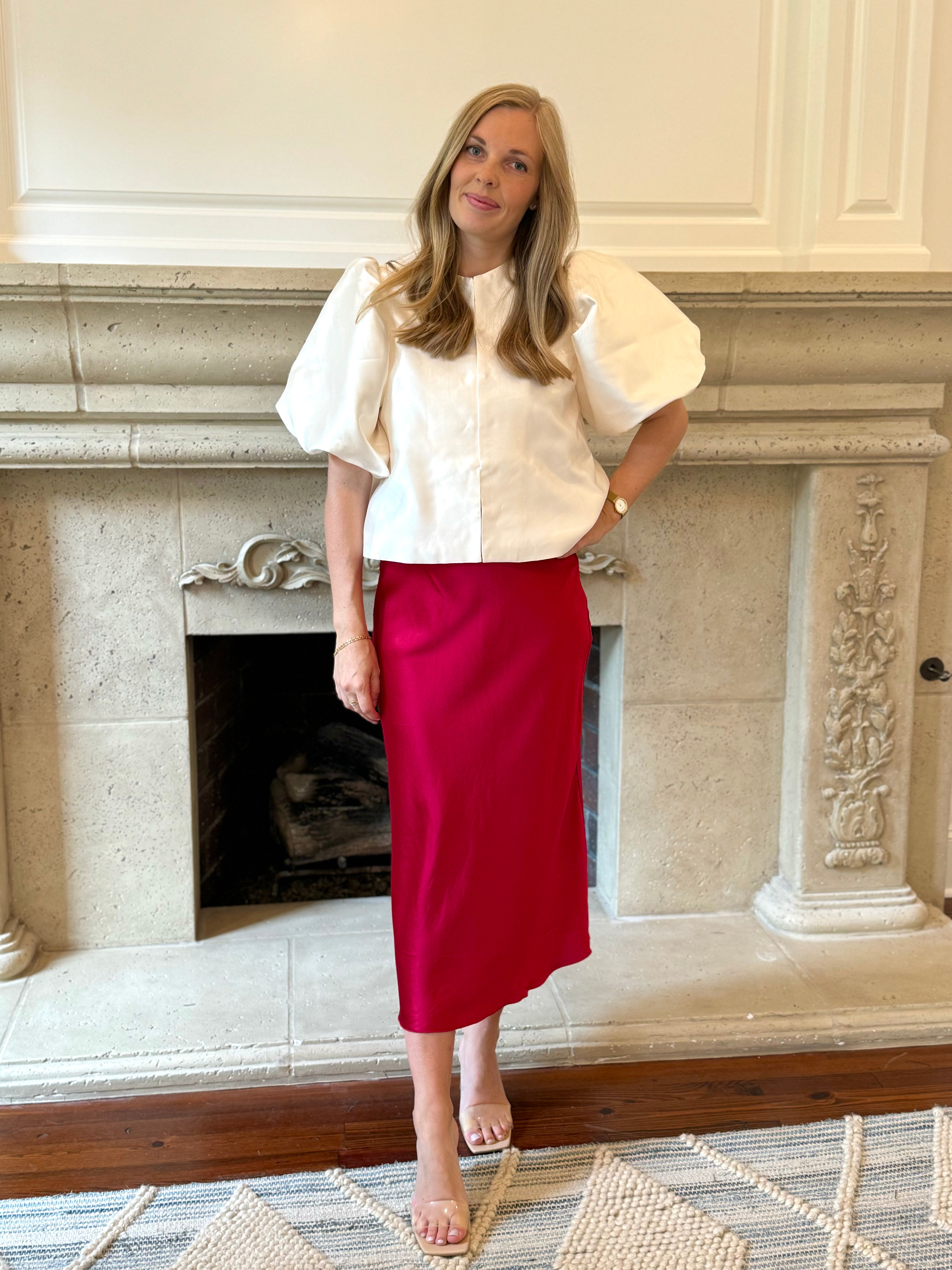 The Hana Skirt in Red is a holiday-season essential, blending elegance with festive flair. Made from luxurious satin silk with a hint of stretch, this midi skirt drapes beautifully, thanks to its bias-cut design that flatters every silhouette. The double-layered elastic waistband offers comfort while keeping a sleek fit, making it ideal for long holiday gatherings. In a rich, festive red, the Hana Skirt pairs perfectly with a cozy knit or oversized tee for a chic daytime look, and transitions effortlessly into evening when styled with a silk blouse or shimmering top. This skirt is your go-to piece for celebrating the season in style.