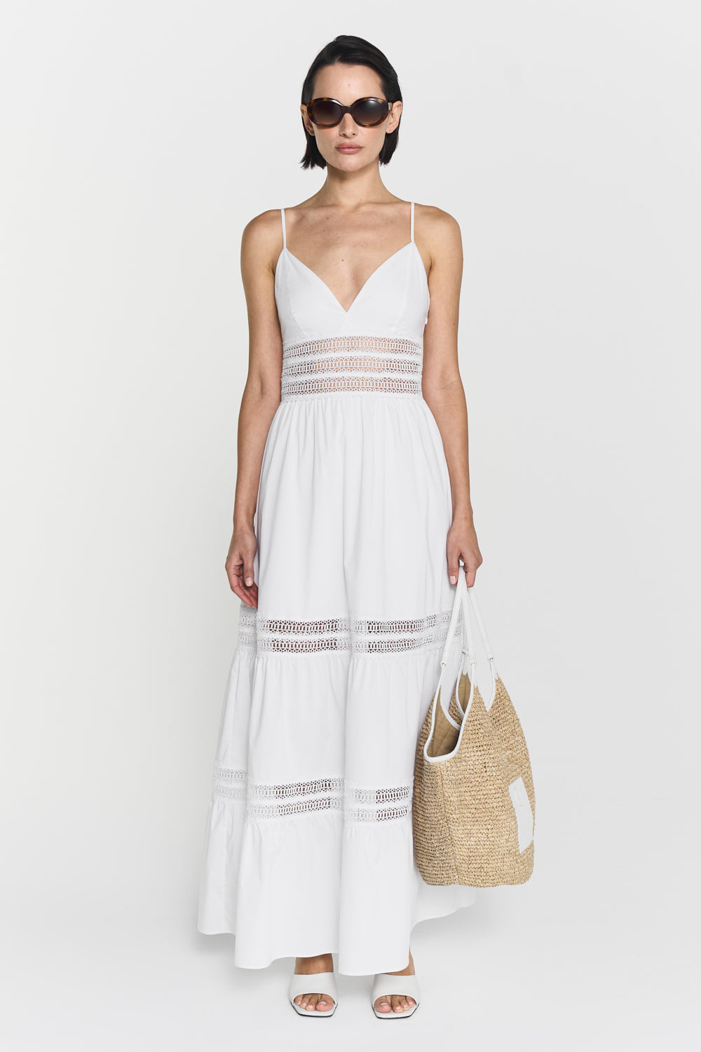 The Magnolia Dress is a romantic and feminine piece crafted from a cotton blend. Featuring delicate lace panels, adjustable straps, and a lined skirt, it offers a flattering long midi length, making it perfect for a variety of occasions.