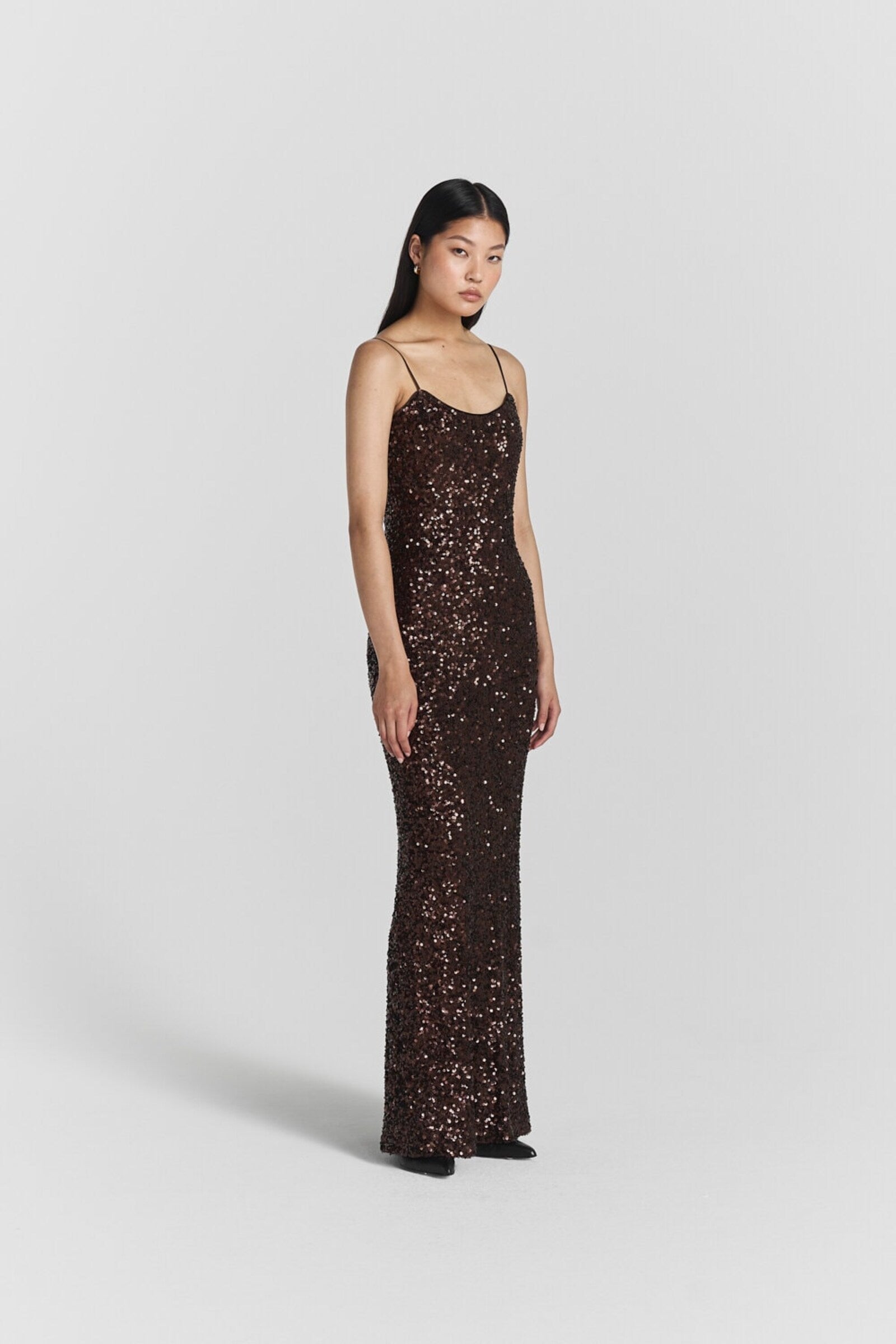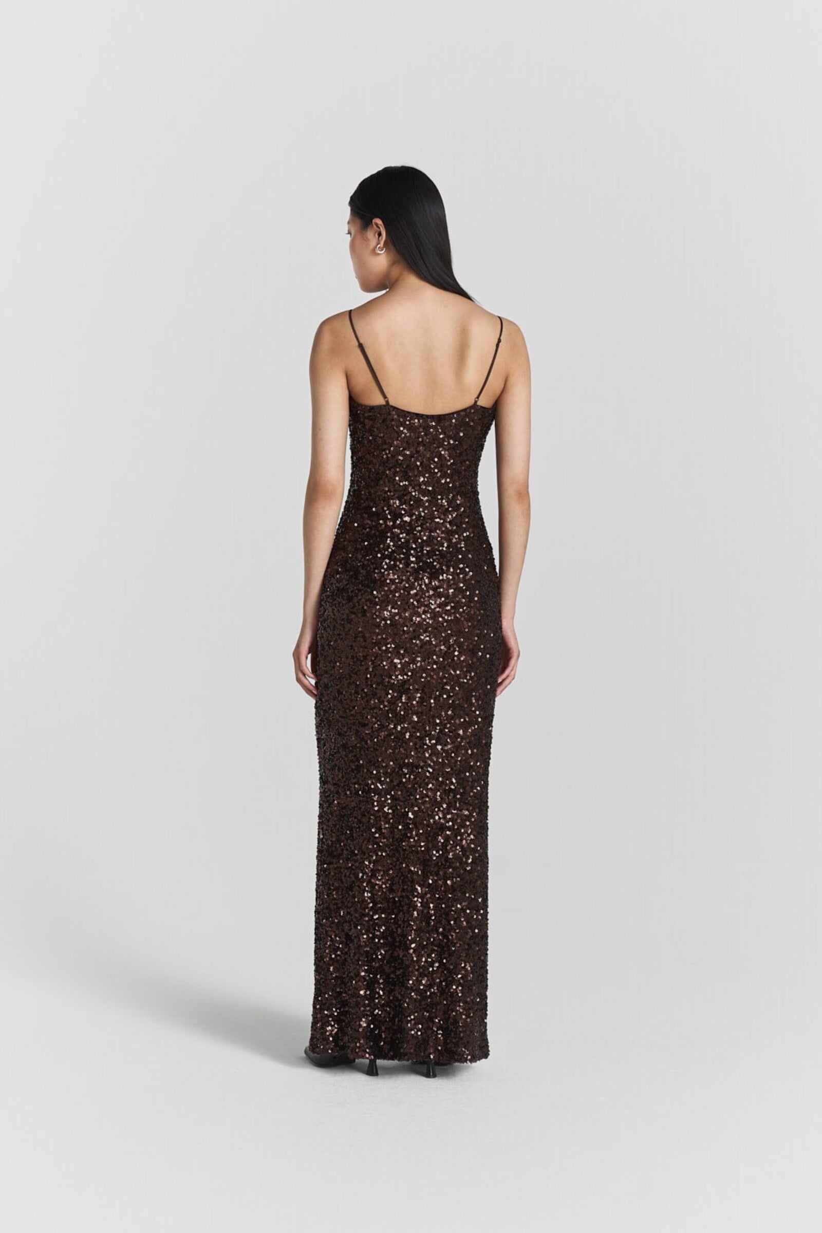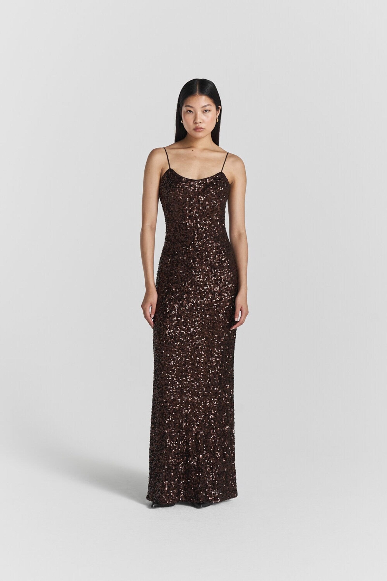 Make a statement at any event with the Gertrude Sequin Maxi Dress in Rich Brown. This glamorous dress is adorned with shimmering sequins that catch the light beautifully, ensuring you’ll turn heads all night. Designed in a flattering maxi length, it features adjustable shoulder straps for a perfect fit and a hidden side zip for a seamless look. Elegant yet bold, the Gertrude Sequin Maxi Dress is the ultimate choice for special occasions where you want to shine.