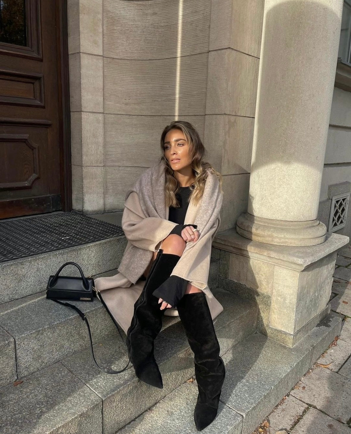 The Bonn Boots in Black are a chic and versatile high boot crafted from luxurious black suede. Featuring a stylish PU leather side strap detail, these boots exude modern sophistication. The pointed toe adds a sharp, edgy touch, while the wide, elongated shaft offers the flexibility to wear them slouched or straight, creating a variety of looks. Perfect for elevating any outfit, the Bonn Boots are a timeless addition to your footwear collection.