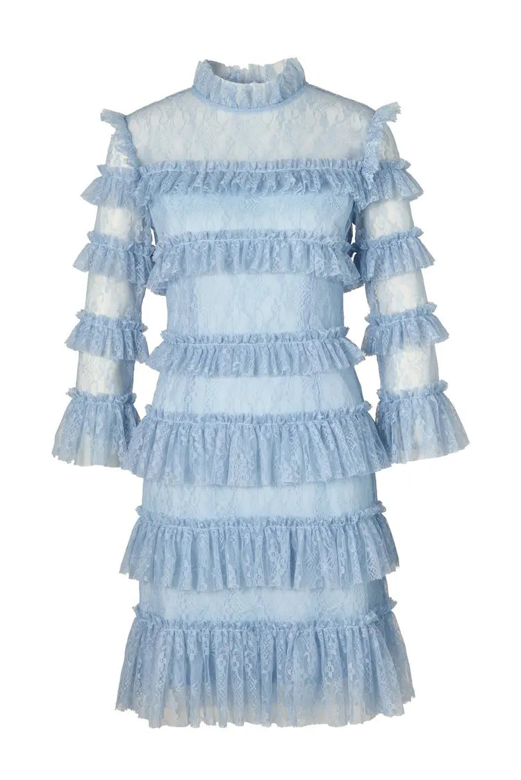 Romantic and statement-making, the Carmine Mini Dress is designed to turn heads. Crafted from delicate lace with cascading ruffle details, this figure-hugging silhouette exudes elegance with a touch of drama. The high lace neckline and long sleeves create a refined contrast to the flirty mini-length skirt, making it the perfect choice for special occasions. Finished with a hidden back zipper for a seamless look, the Carmine Dress is a showstopping piece that blends timeless sophistication with modern allure.